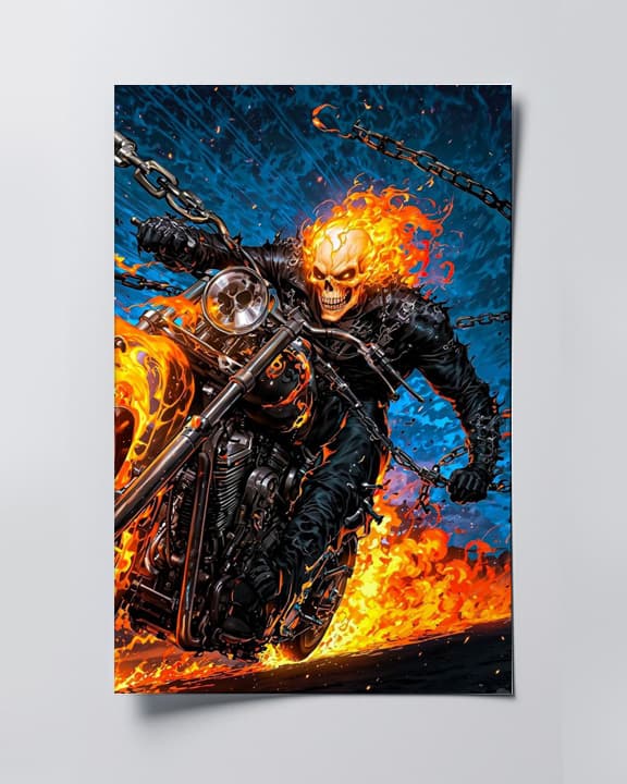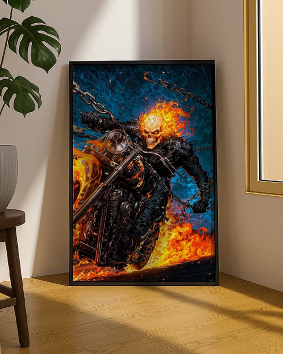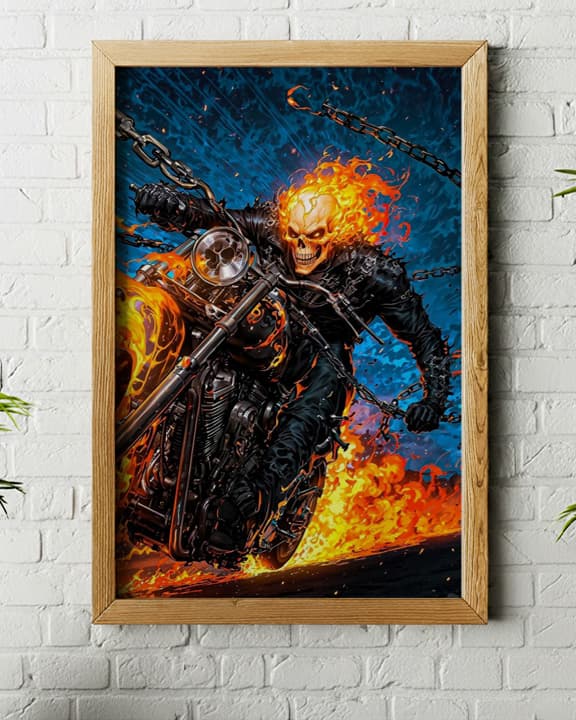 The image displays a piece of Ghost Rider Wall Art, featuring the iconic Marvel character on his fiery motorcycle.