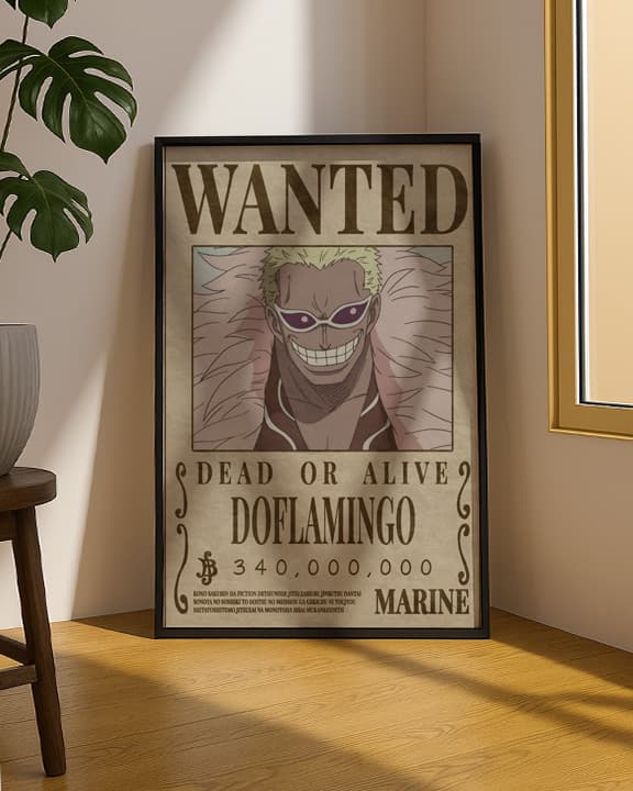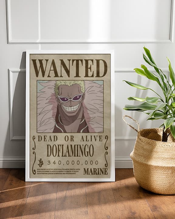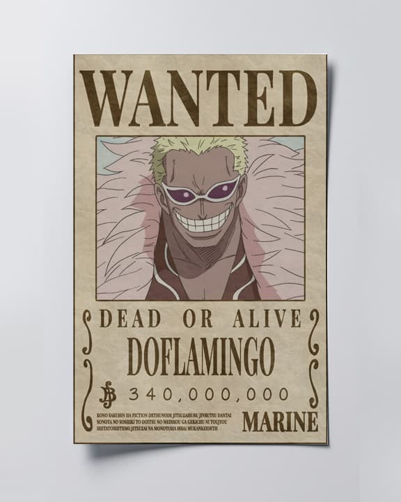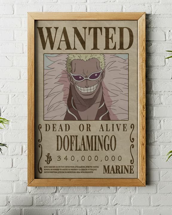 The image shows a wanted poster for the character Donquixote Doflamingo from the anime and manga series One Piece.