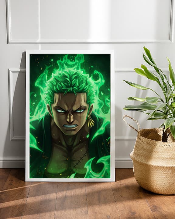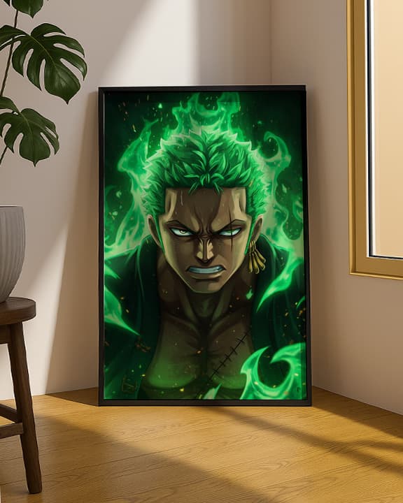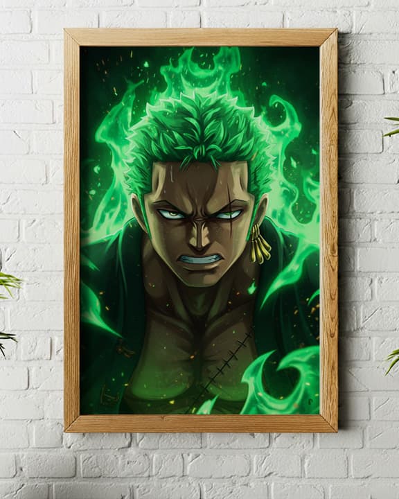 The image shows a metal poster featuring the character Roronoa Zoro from the anime and manga series One Piece.
